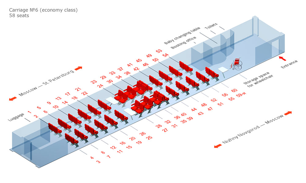 Toutes les voitures dispoents d'un espace pour les bagages. Les voitures de la classe économique ont des sièges spéciaux pour les voyageurs avec des animaux de compagnie. Notez qu'il est interdit de fumer dans le train.